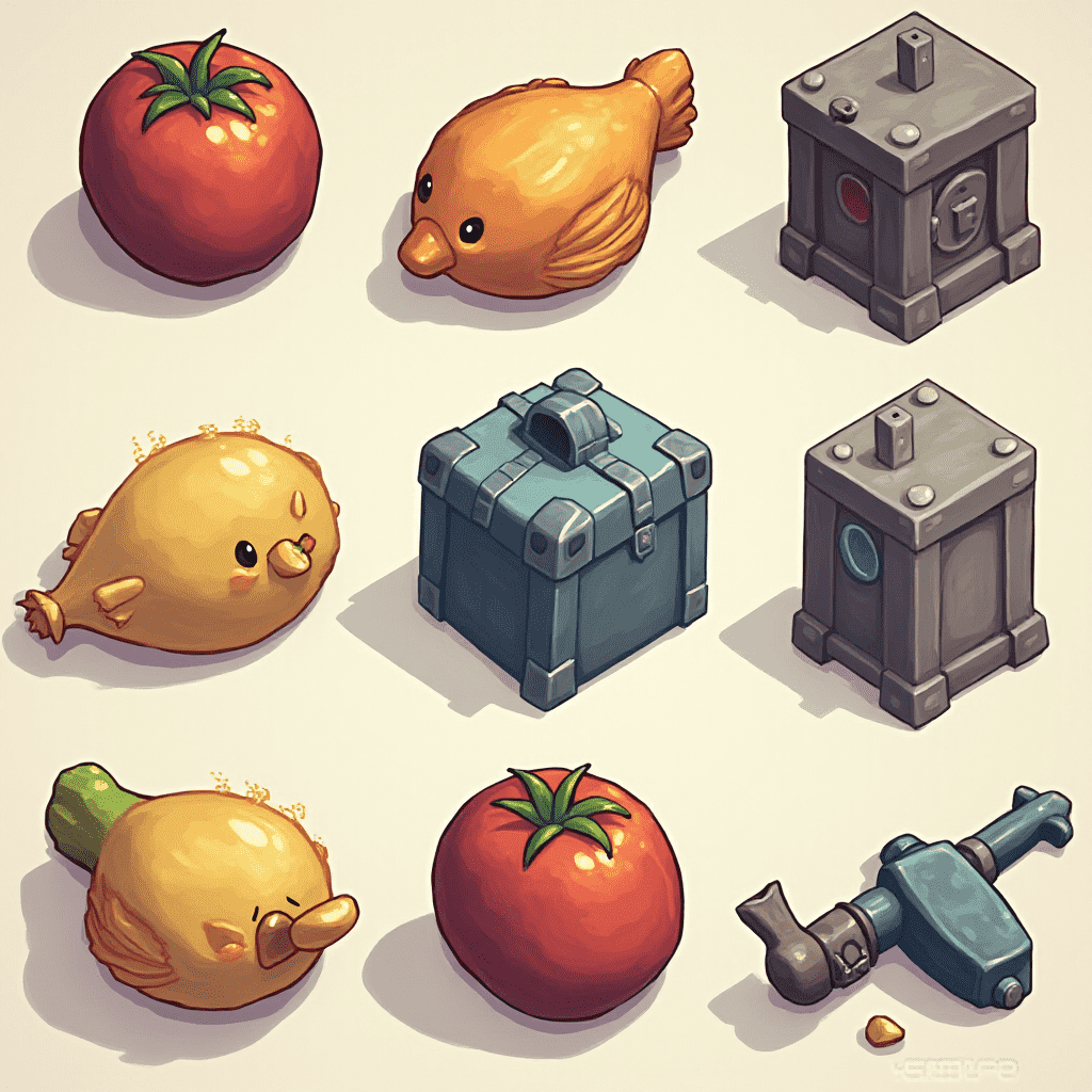 Nine whimsical objects, including a tomato, bird, fish, and chest, are arranged in a 3x3 grid against a light beige backdrop.