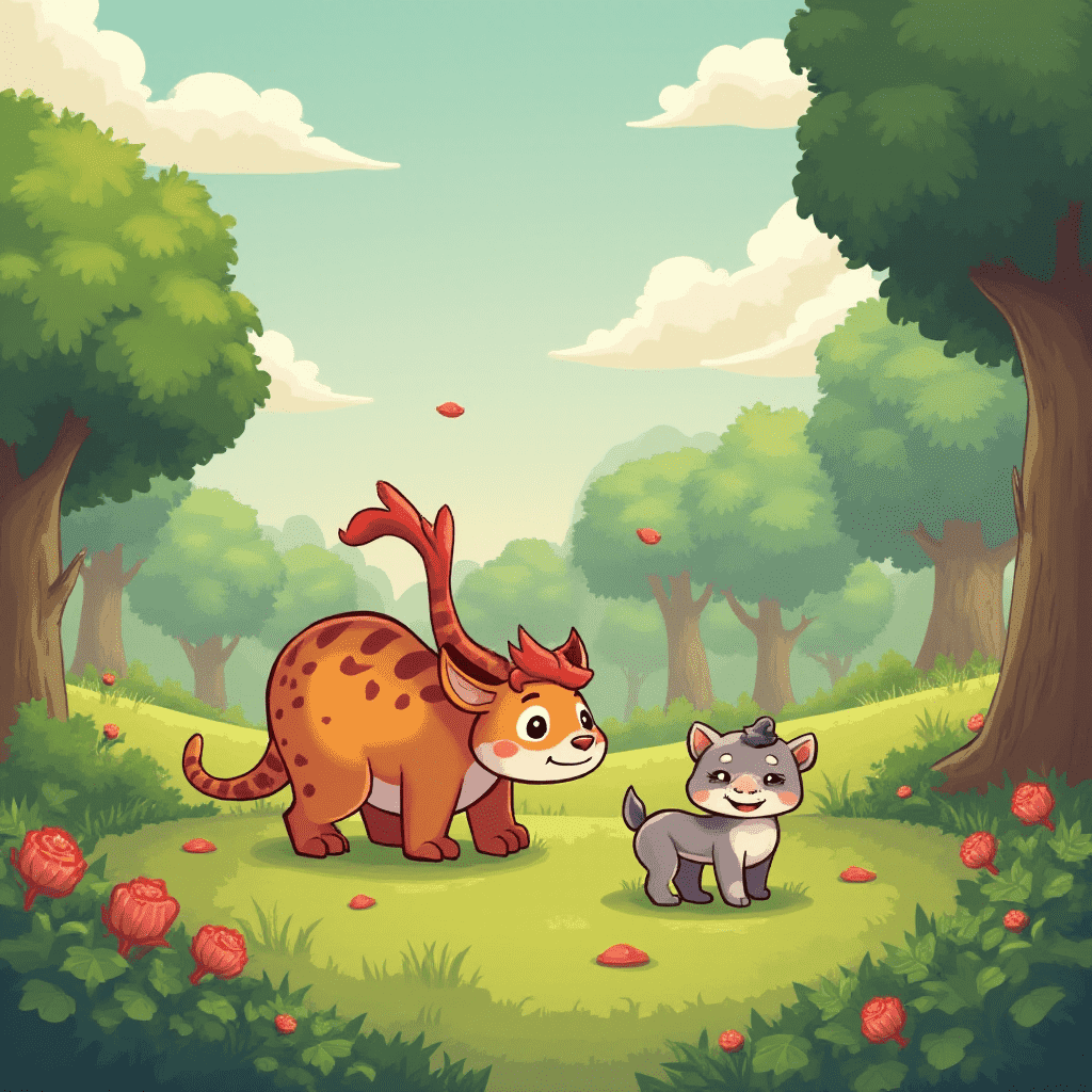 An orange creature with red hair and a smaller gray creature stand in a lush green forest, surrounded by red flowers and a light blue sky.