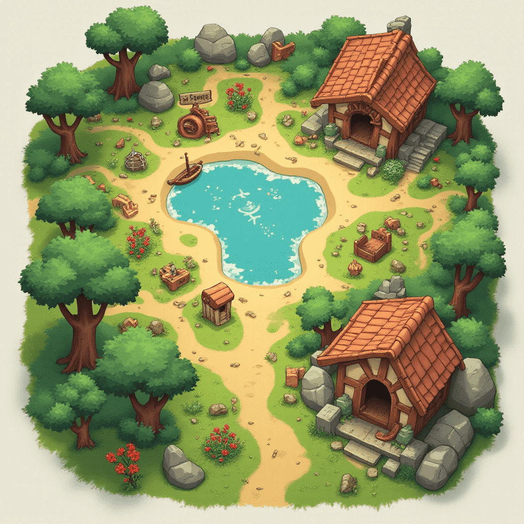 A picturesque village scene features a central pond, surrounded by trees and houses with red roofs, wooden structures, and scattered red flowers.