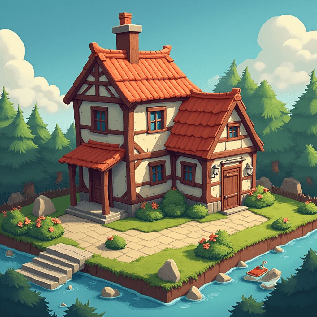 A quaint cottage with red roof and wooden beams sits on a small island, surrounded by blue water and green trees.