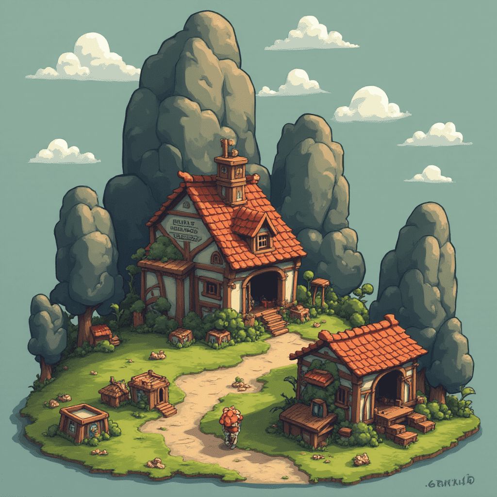 A quaint red-roofed house, labeled "ORCHID HIGHWOOD," sits amidst a verdant landscape, accompanied by smaller structures and a person in red.