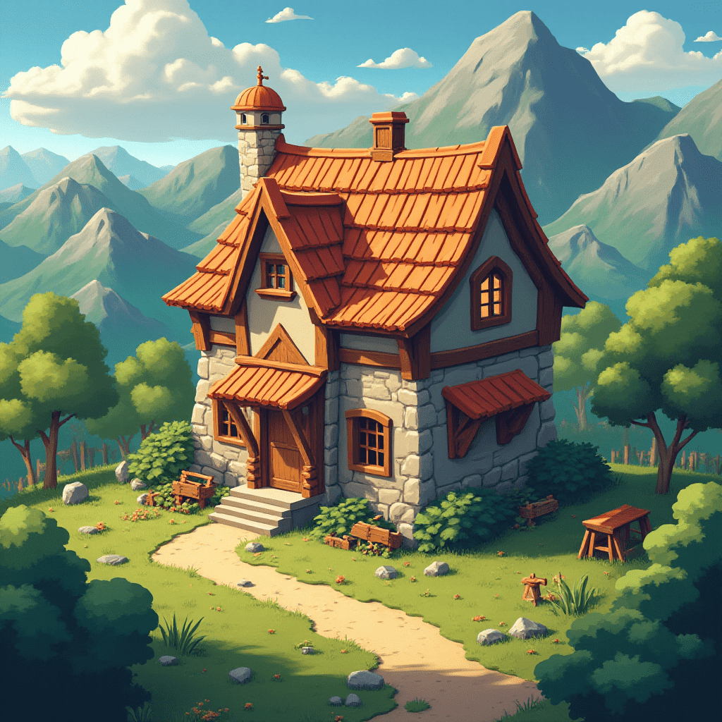 A quaint stone cottage with a red tiled roof sits amidst a lush landscape, surrounded by trees, bushes, and mountains.