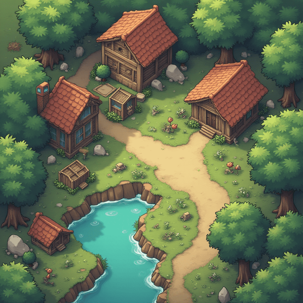 A quaint village with red-roofed wooden buildings, a river, and lush greenery is nestled in a dense forest.