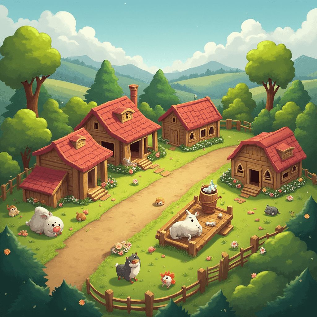 A quaint village with red-roofed wooden houses, lush greenery, and cartoon animals, set against a backdrop of rolling hills and blue sky.