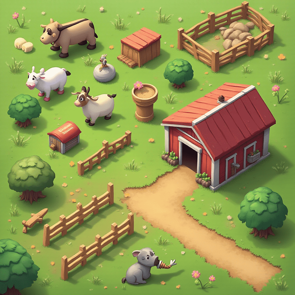 A red barn, wooden fence, and dirt path populate a cartoon farm scene, accompanied by cows, a gray pig, and a bird.