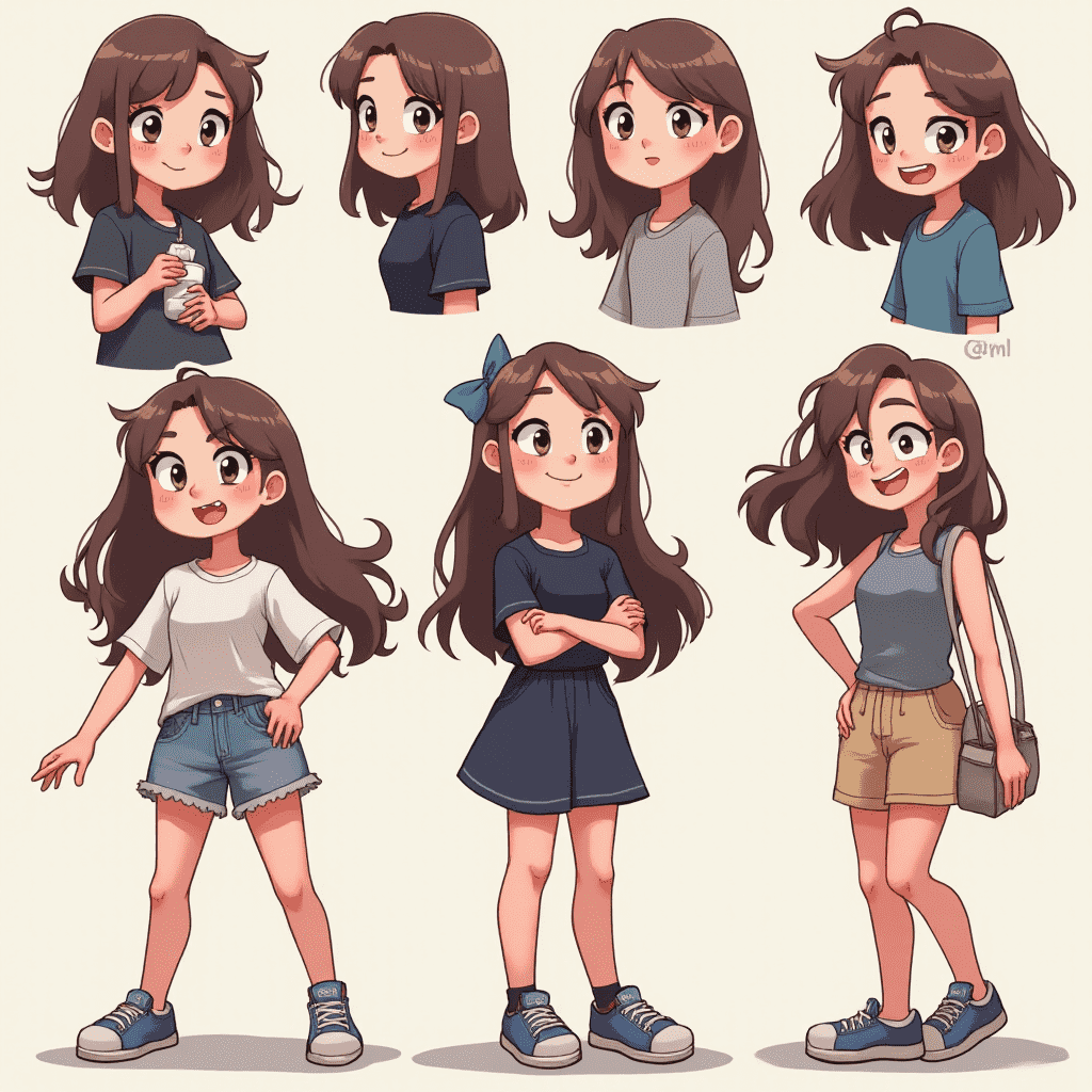 Seven cartoon girls with brown hair and diverse outfits, displaying various poses and expressions.