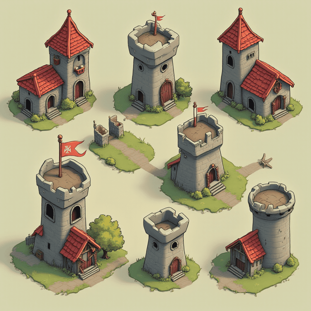 Seven medieval-style buildings, including towers, houses, and churches, are arranged in a grid on grassy terrain, featuring red roofs and gray walls.
