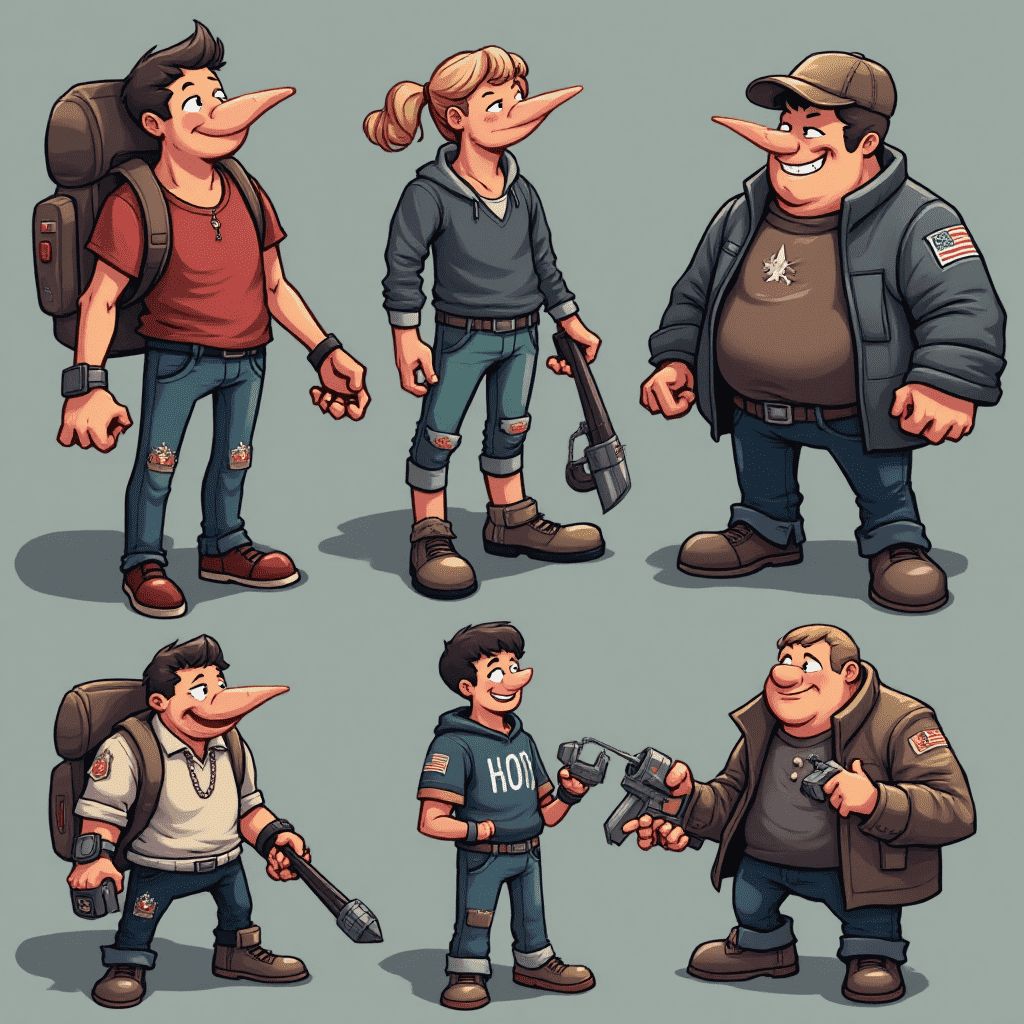 Six cartoon characters, each unique in appearance and attire, stand against a light blue backdrop, displaying diverse expressions and accessories.