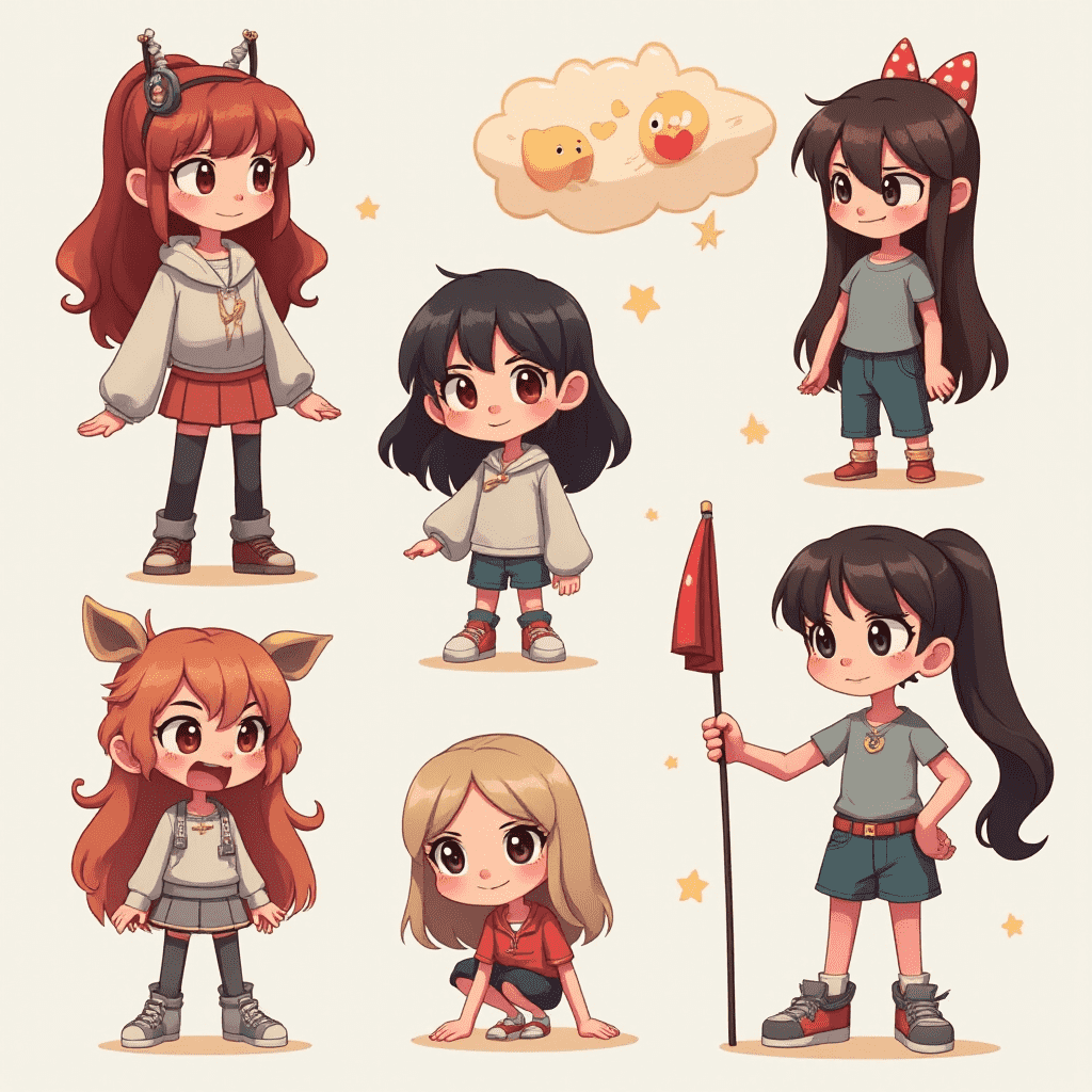 Six stylized cartoon girls in various outfits and hairstyles, holding objects, are arranged in two rows against a light beige background.