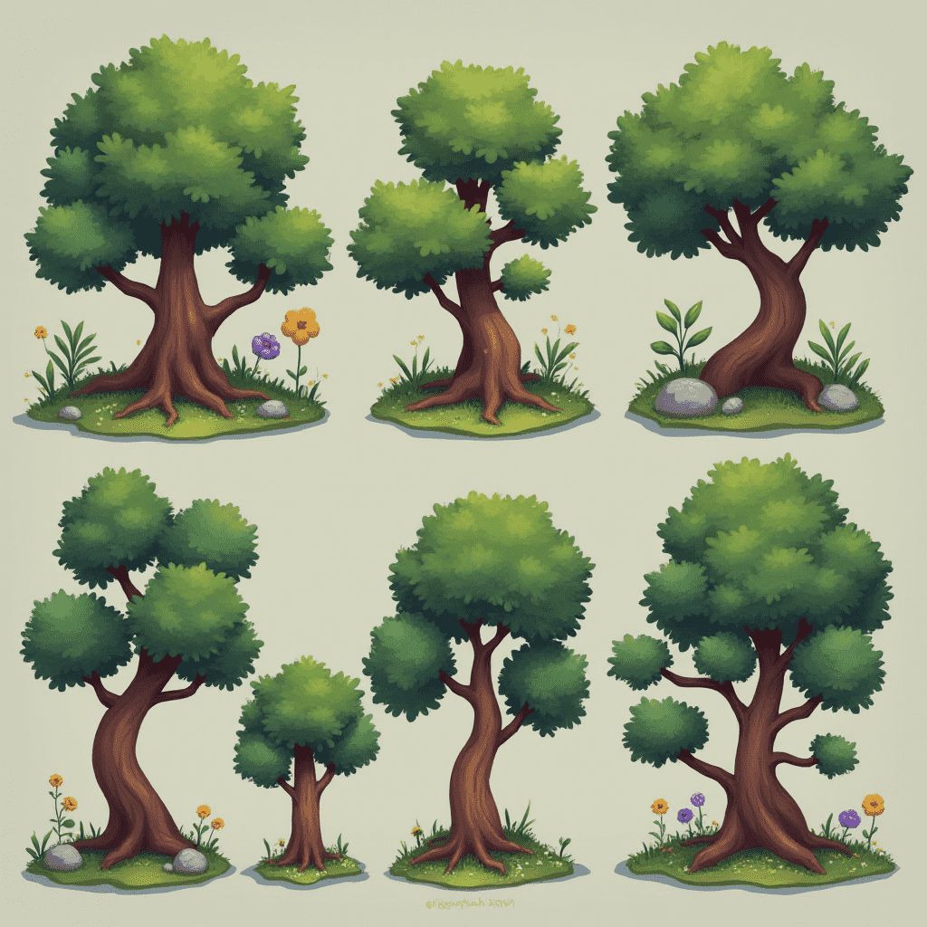 Six stylized trees with green canopies and brown trunks are arranged in two rows, each with small flowers and rocks at its base.