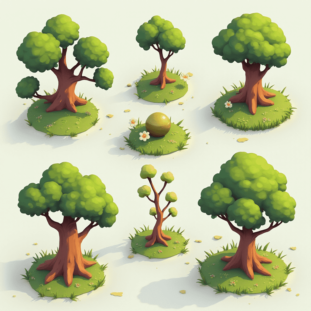 Six stylized trees with unique shapes and sizes are arranged on small green bases, displaying various shades of green leaves.