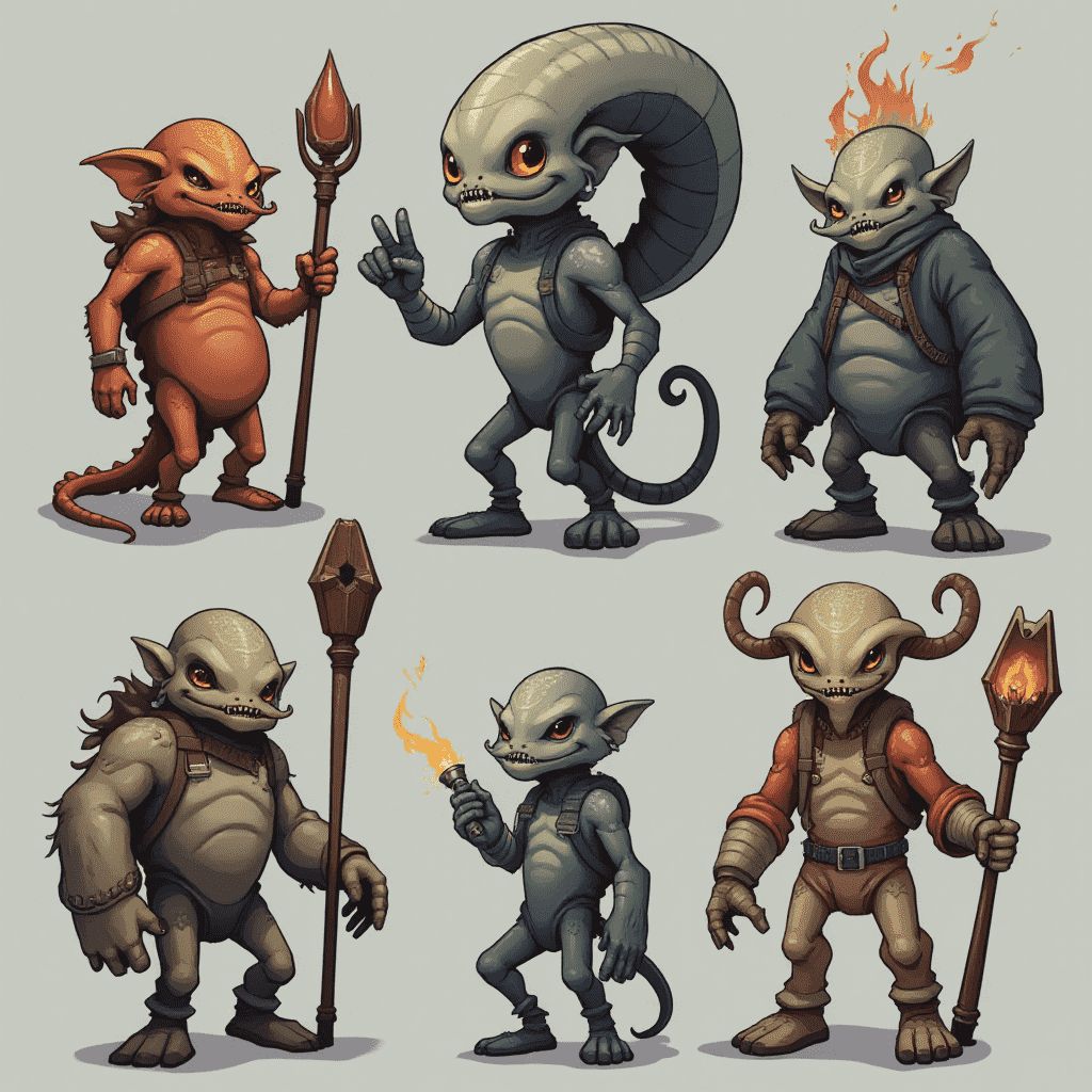 Six unique creatures with distinct features and weapons stand against a light gray backdrop.