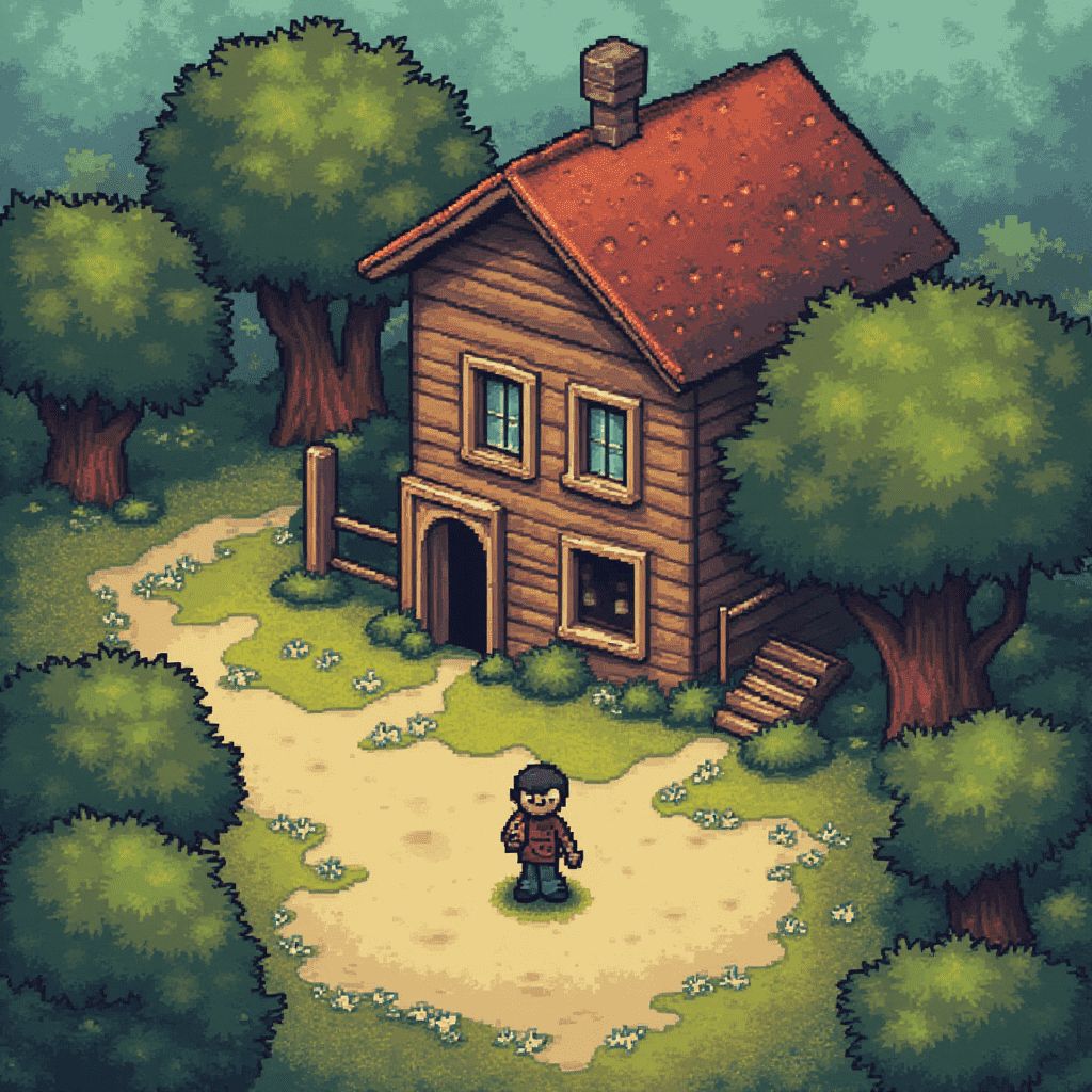 A small wooden cabin with a red roof and chimney stands in a lush green forest, accompanied by a young boy on a dirt path.