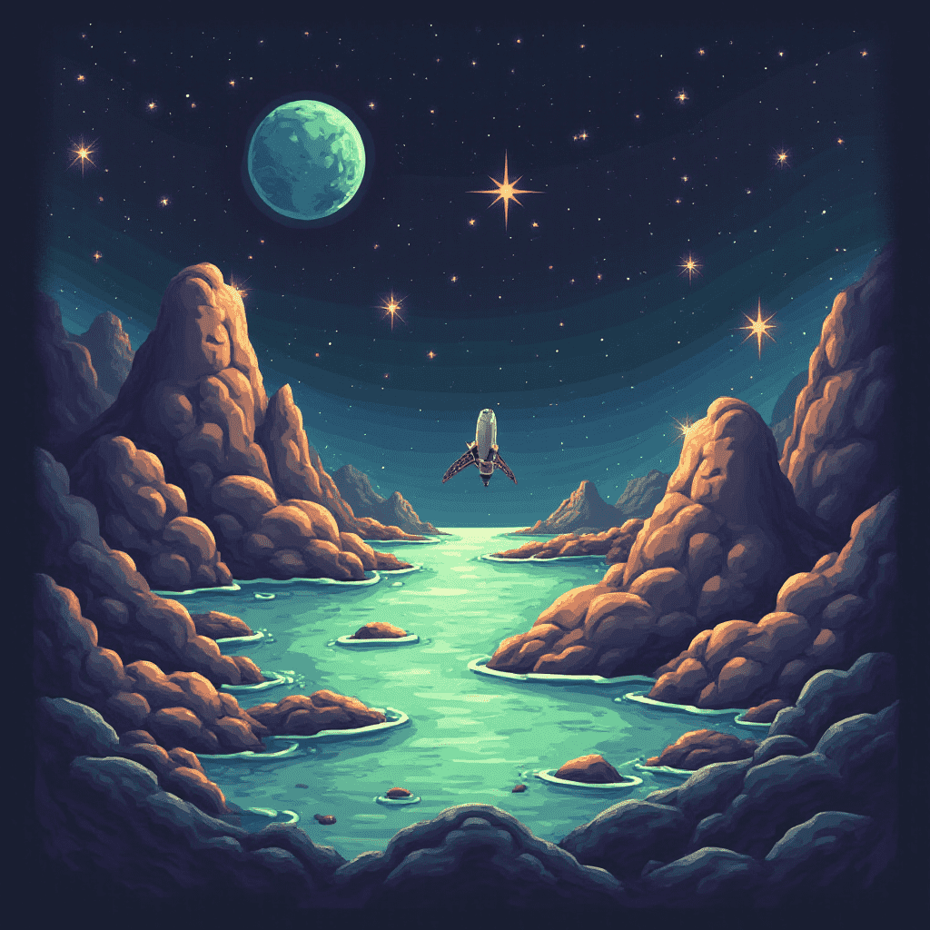 A spaceship soars above a turquoise body of water, flanked by rocky mountains and backed by a star-studded night sky.