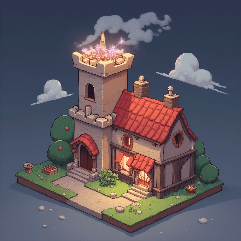 A stone castle with a red roof, tower, and chimney stands on a small island, surrounded by water, with red apples and a small fire pit nearby.