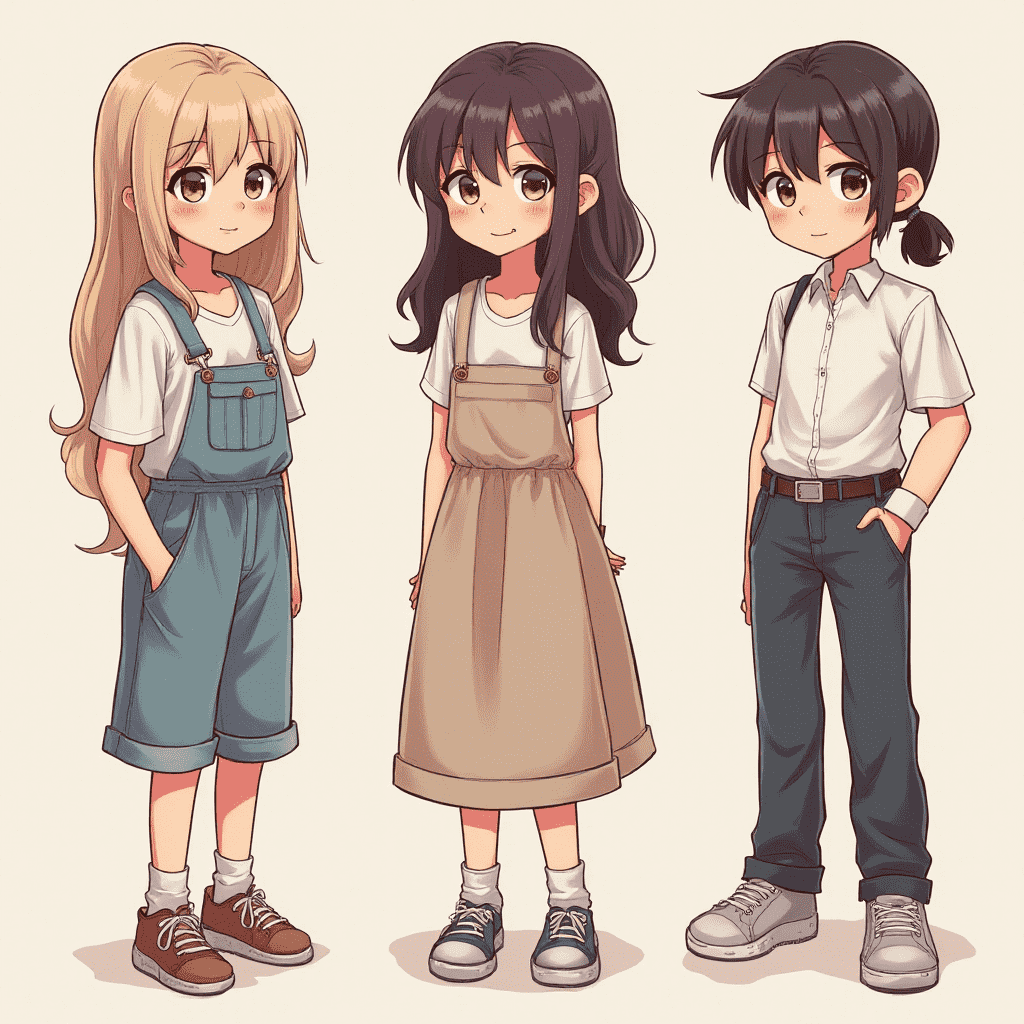 Three cartoon characters, a blonde girl in overalls, a girl in a dress, and a boy in white shirt and blue pants, stand side by side.