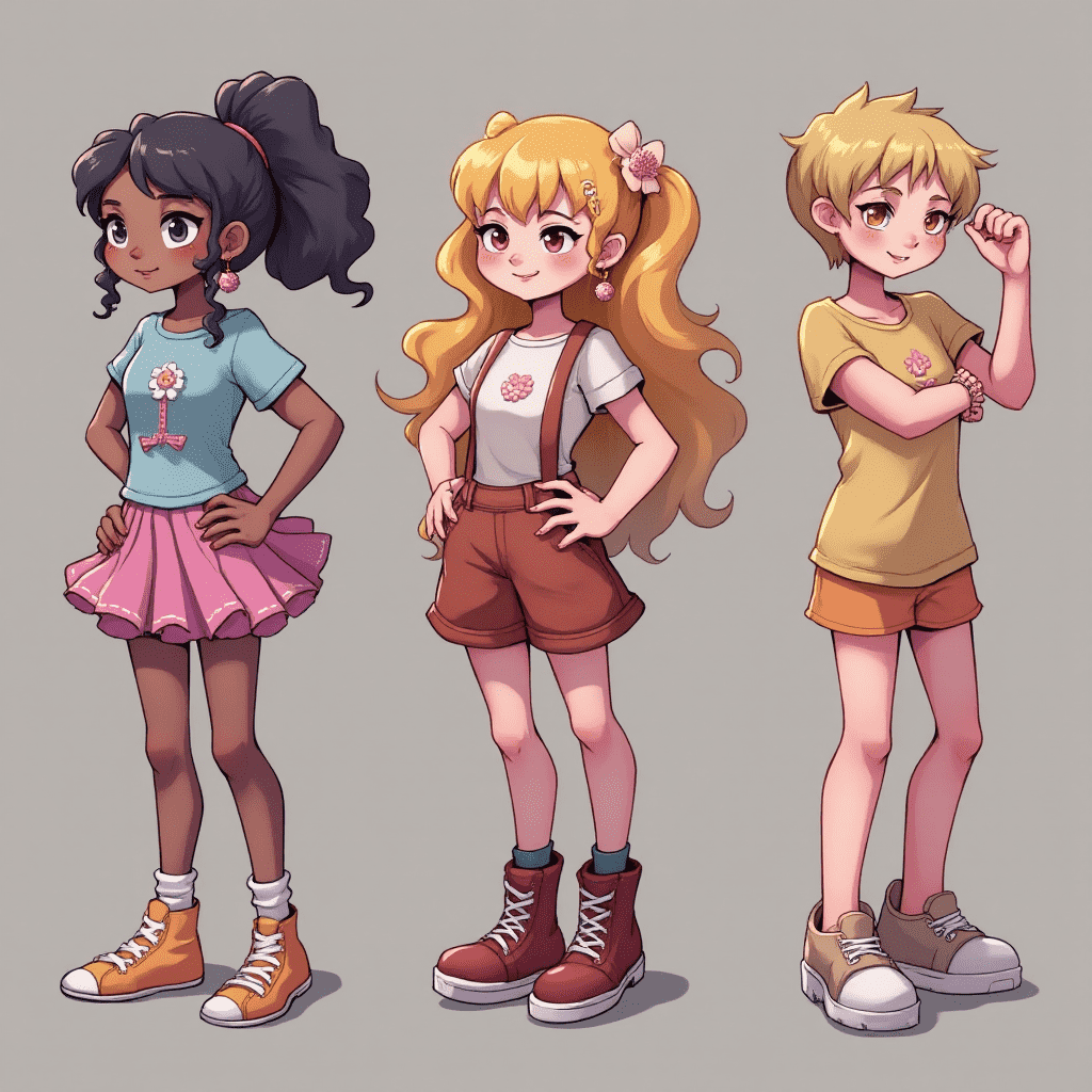 Three cartoon children, each with distinct outfits and hairstyles, stand against a neutral background.