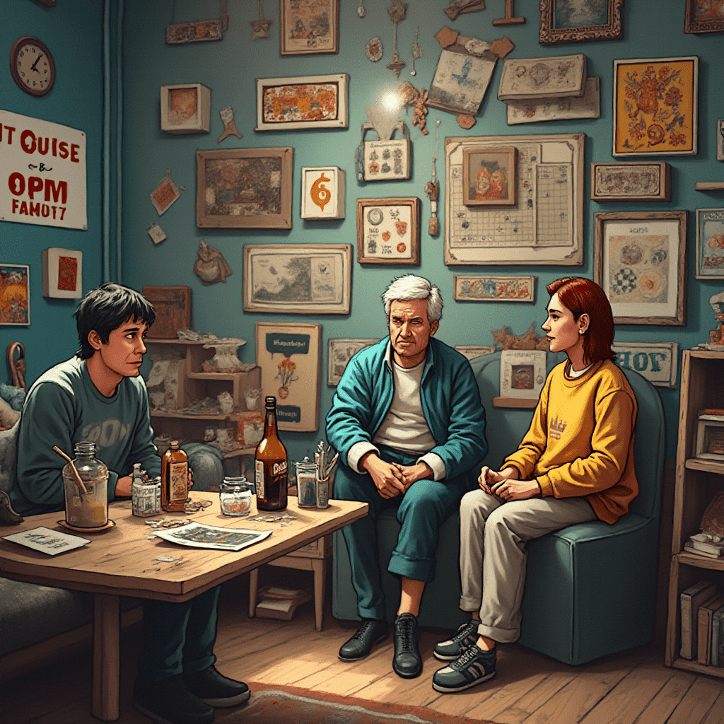 Three individuals converse in a cozy, eclectic room with artwork, plants, and a clock on the wall.