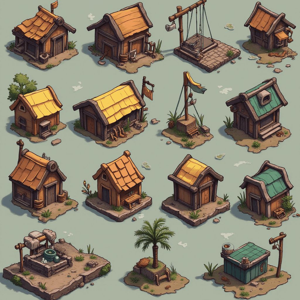 Twelve colorful, rustic houses and structures are arranged in a 4x3 grid on a light blue background, featuring yellow, green, brown, and orange hues.