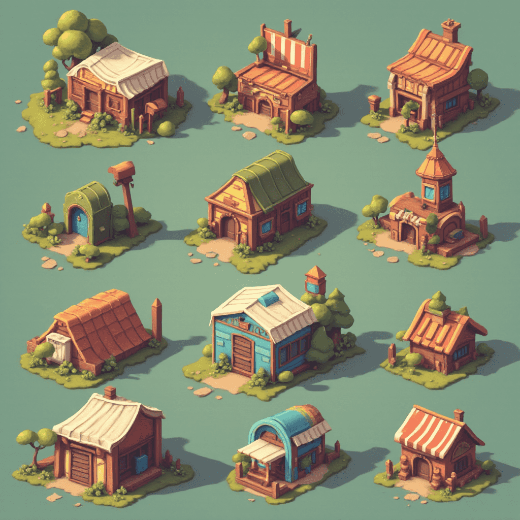 Twelve colorful, whimsical houses with unique features are arranged in a 3x4 grid on a green background.