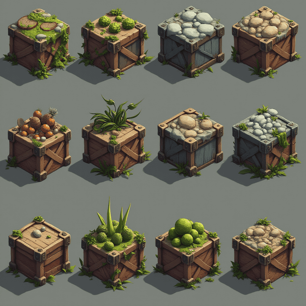 Twelve isometric illustrations of wooden crates with diverse contents, including fruits, plants, rocks, and coins.