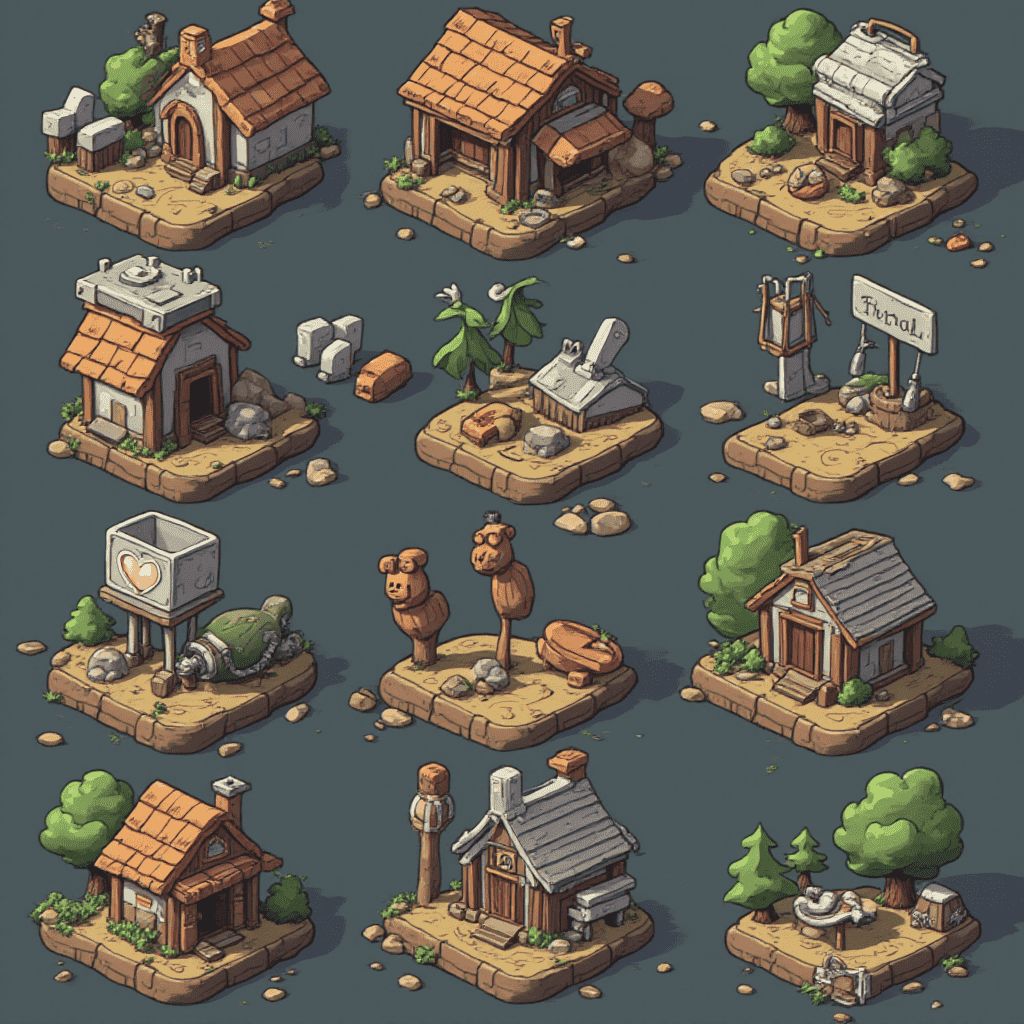 Twelve miniature houses with unique features are arranged in a 4x3 grid on a dark blue background.