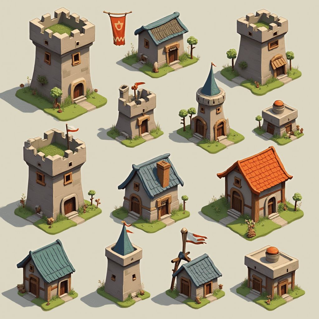 Twelve unique castle-like structures, varying in design, are arranged in a 3x4 grid against a light beige backdrop.