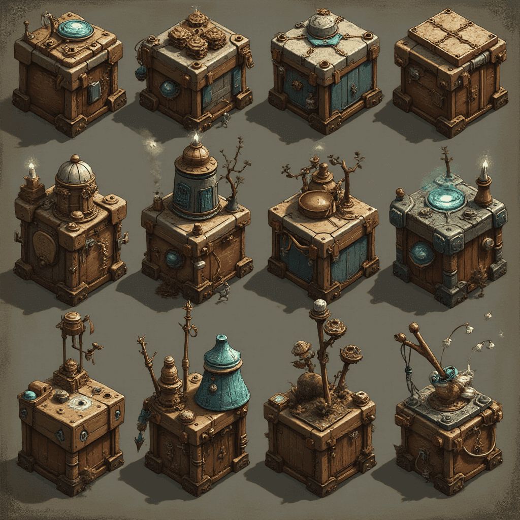 Twelve unique, intricately designed wooden boxes with diverse features are arranged in a 4x3 grid.