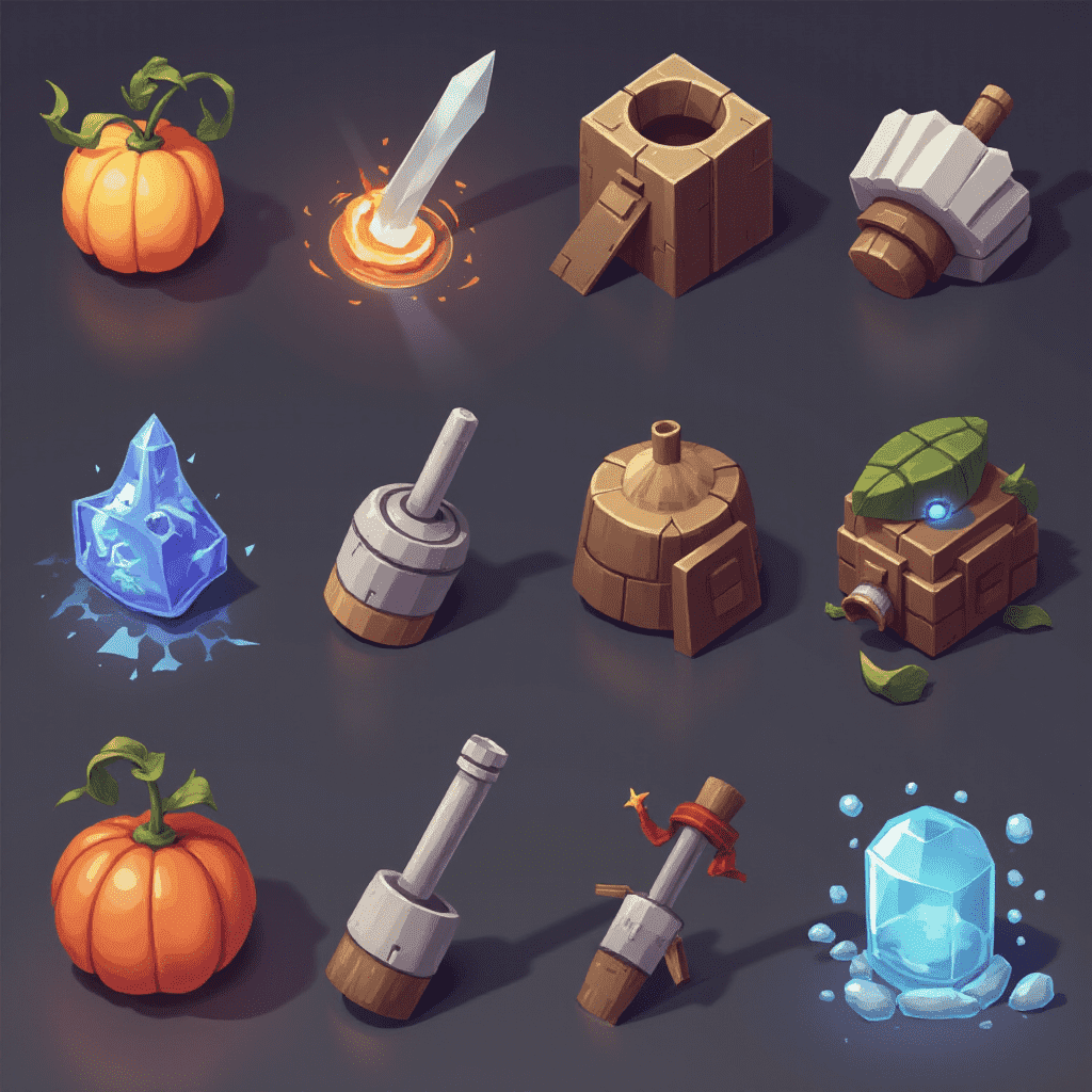 Twelve unique objects, including a pumpkin, sword, box, flame, crystal, barrel, house, pumpkin, brush, crystal, and blue ice, are arranged in a 3x4 grid.