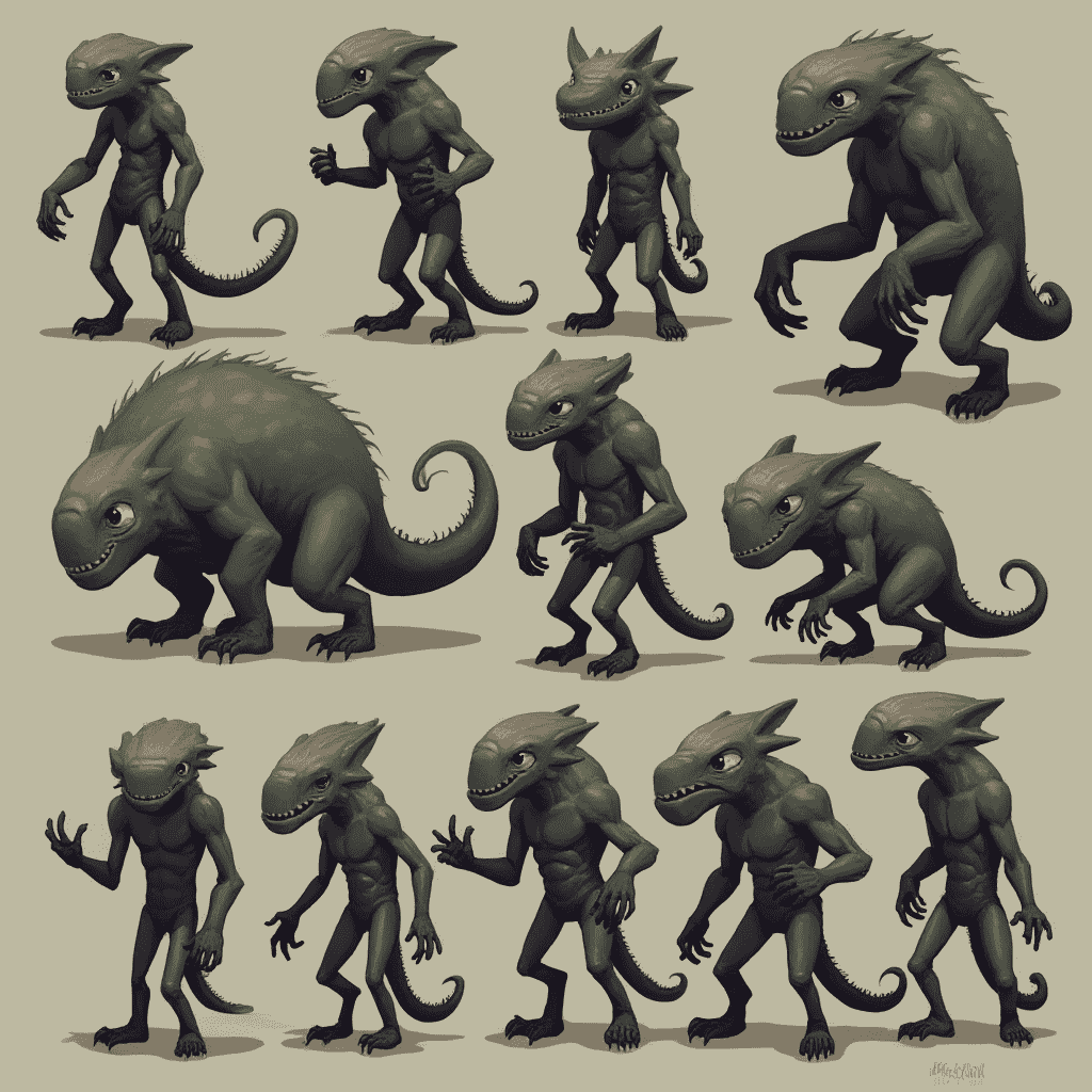 Twelve unique, stylized creatures with long tails, pointed ears, and large eyes are depicted in various poses against a light beige background.