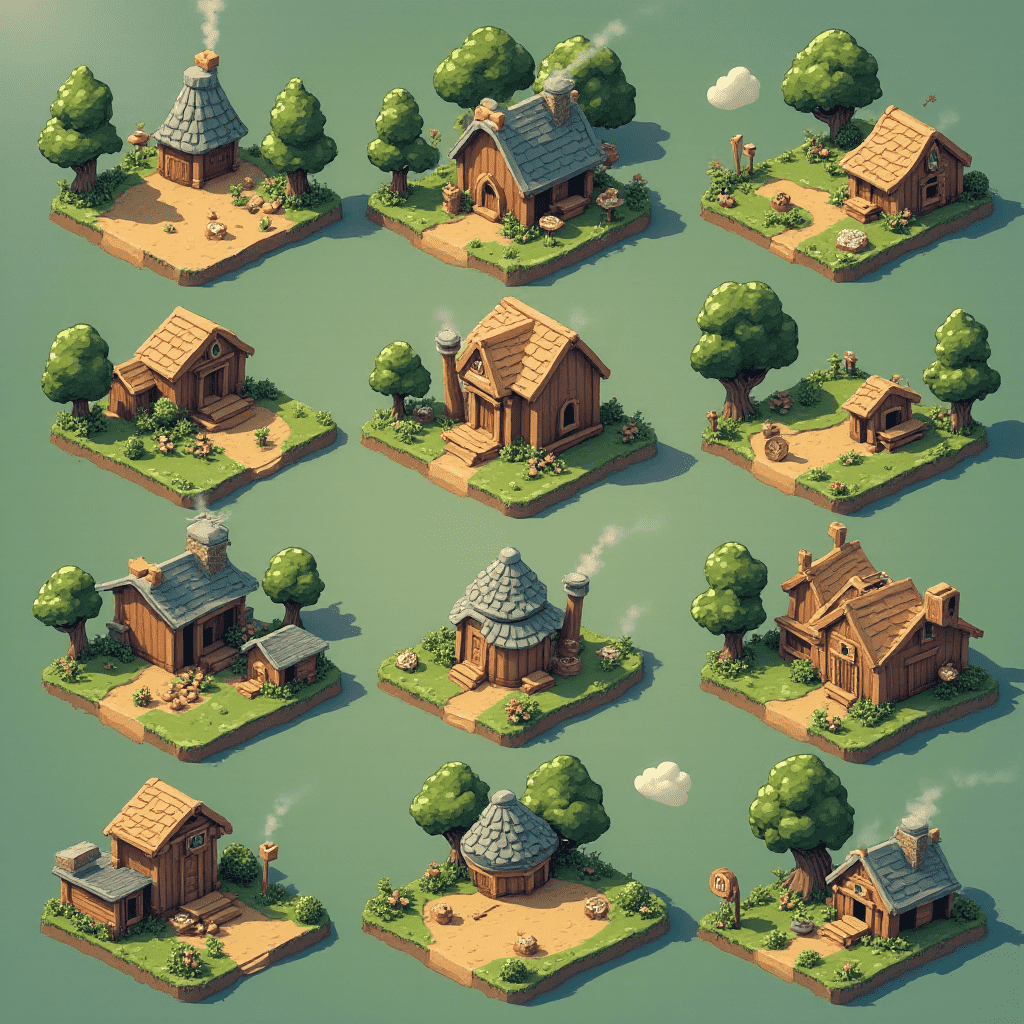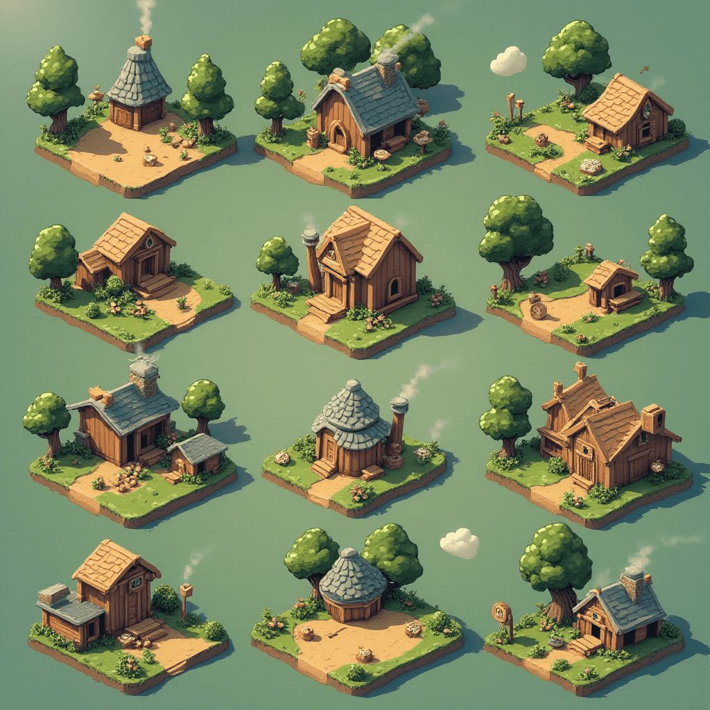 Twelve whimsical, low-poly houses with unique features are arranged in a 4x3 grid on a vibrant green backdrop.