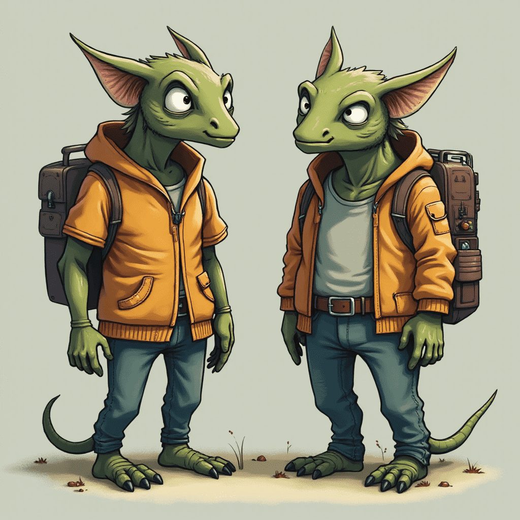 Two green lizard-like creatures, wearing orange jackets and backpacks, stand facing each other on a patch of dirt with grass.