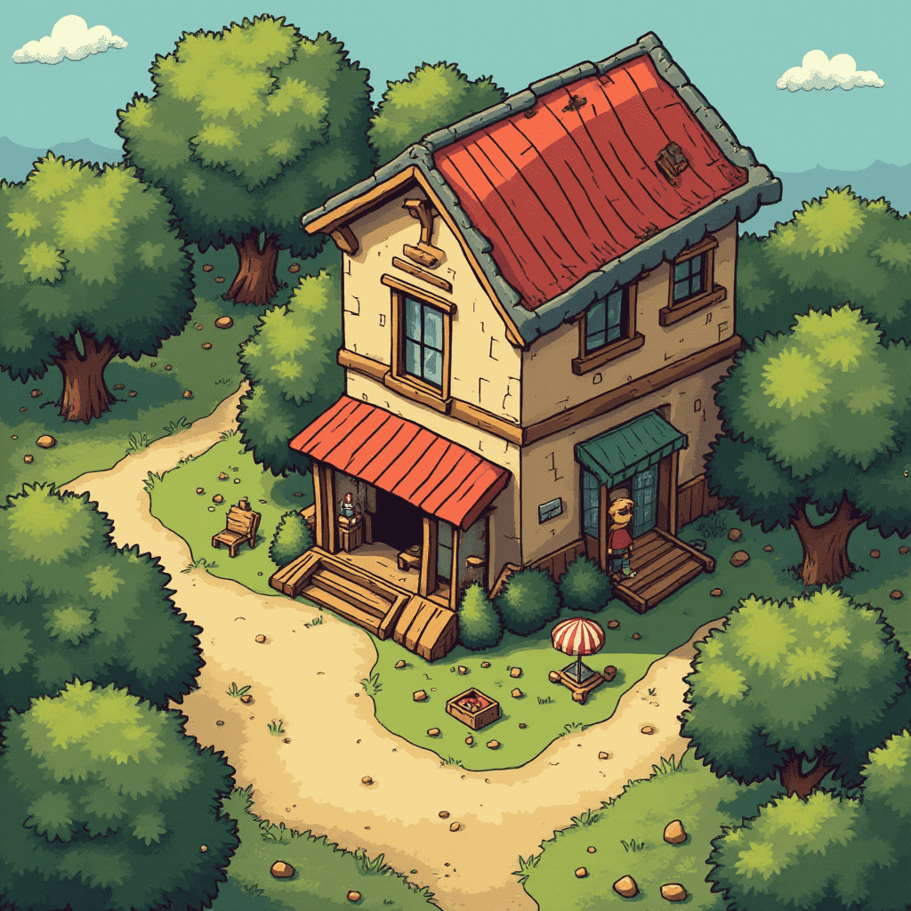 A two-story house with a red roof, green awning, and porch is nestled in a forest, surrounded by trees and rocks.