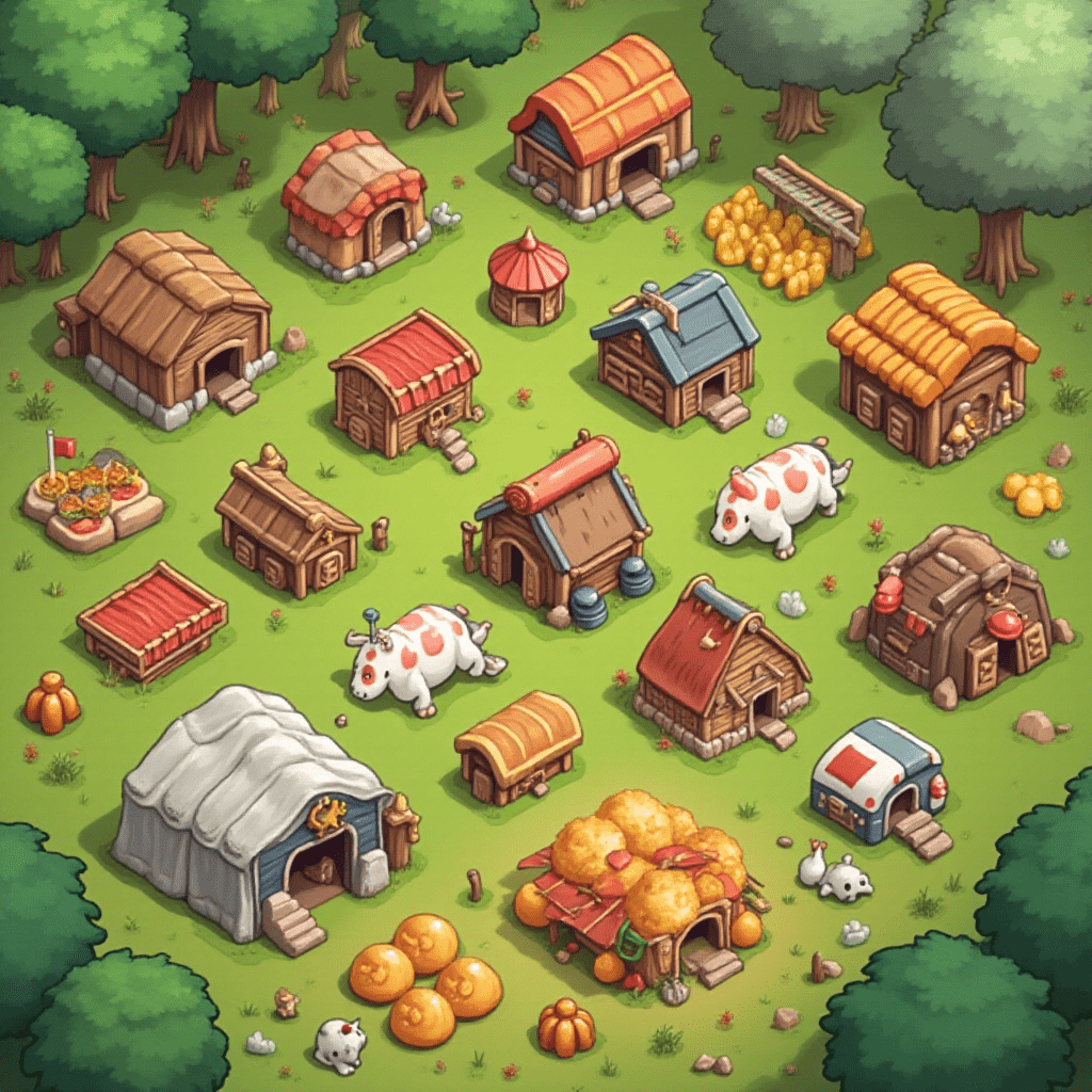 A village of wooden houses, farm buildings, and animals coexists in a lush green forest.