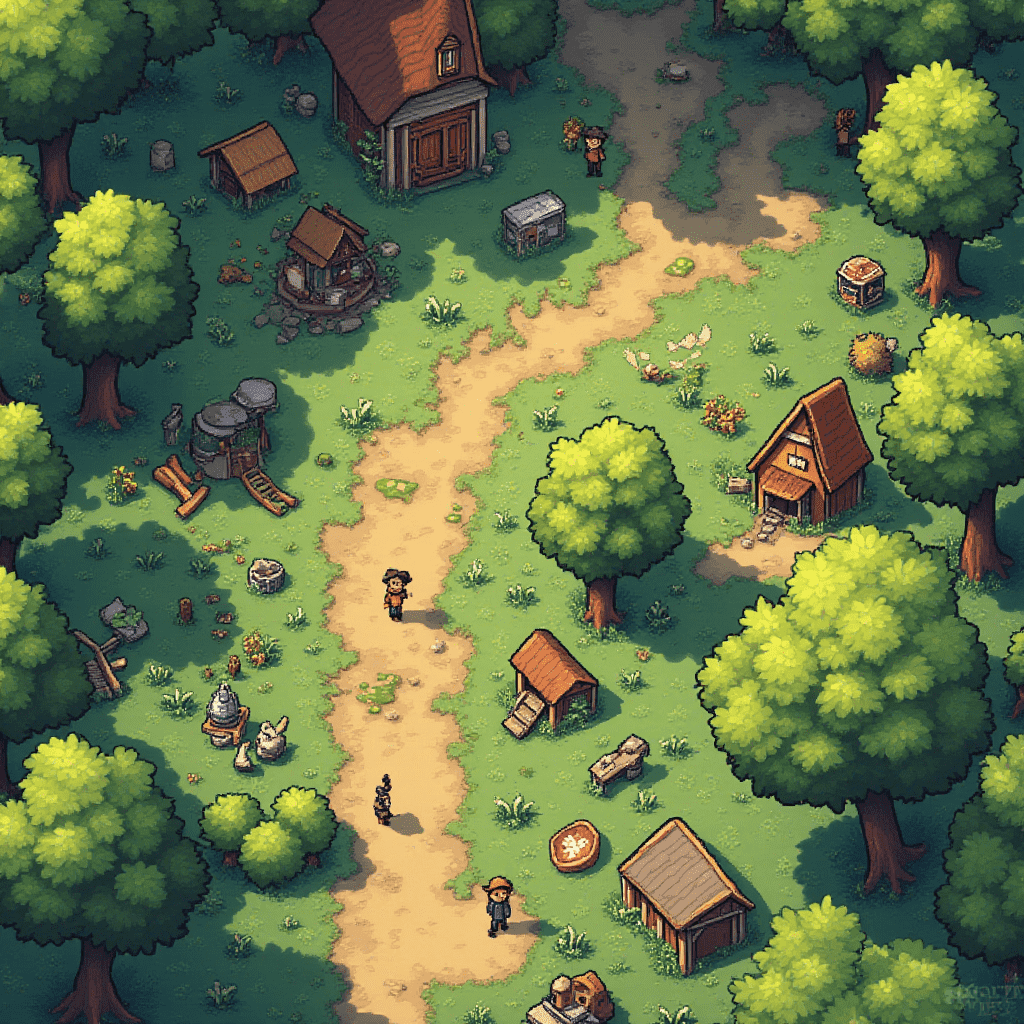A village scene features wooden buildings, trees, bushes, animals, and people engaged in various activities.