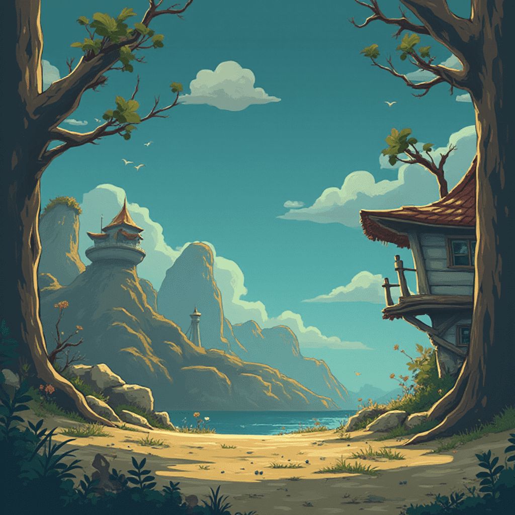 A wooden house with a red roof sits on a cliff overlooking a calm blue sea, accompanied by a lighthouse and birds in mid-flight.